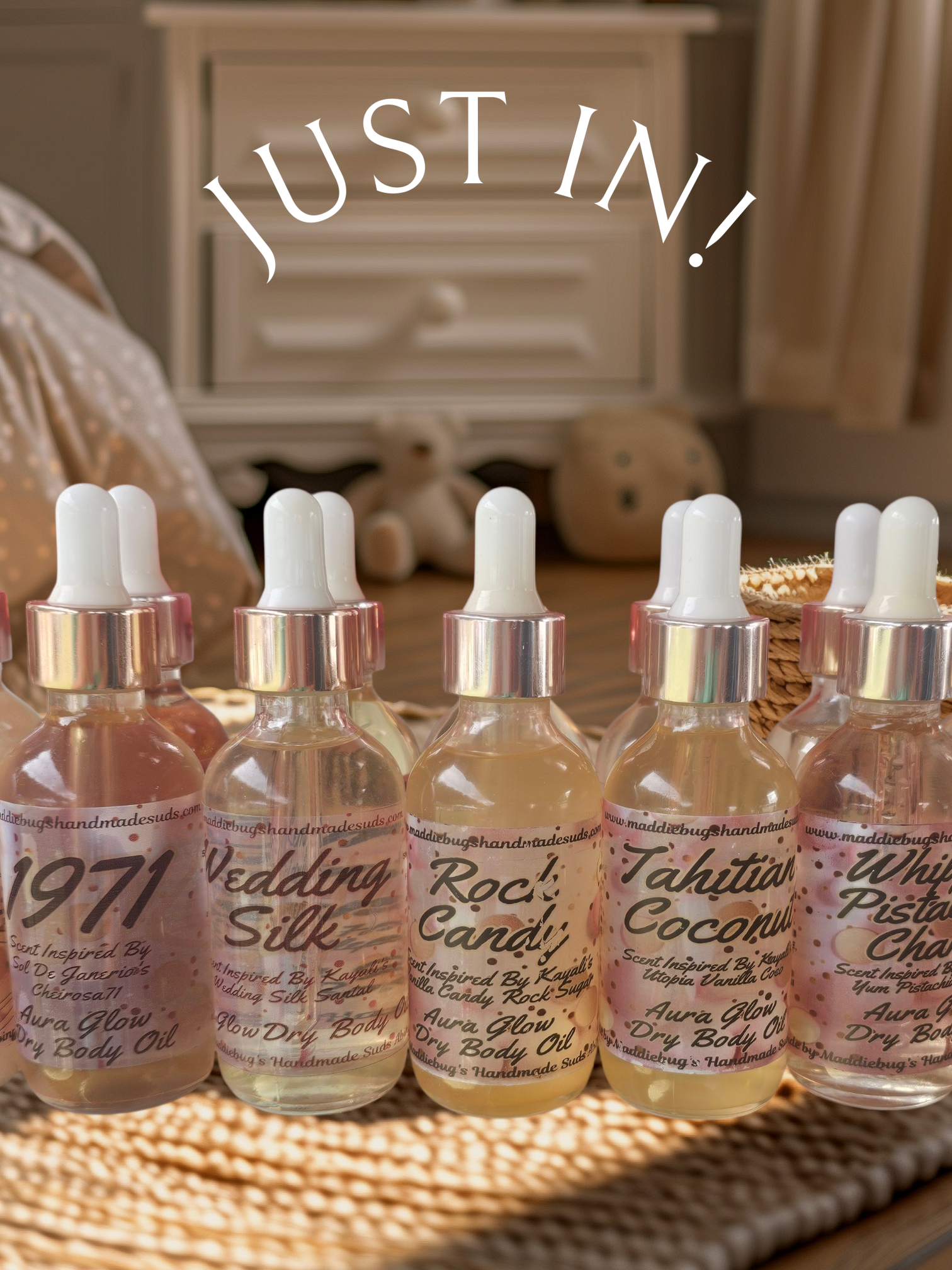 Give your skin a radiant, lit-from-within glow with our lightweight Aura Glow Dry Body Oil. This fast-absorbing formula nourishes deeply without leaving a greasy residue, wrapping your skin in silky hydration and a soft luminous finish. Infused with skin-loving botanicals and antioxidant oils, it helps smooth, soften, and enhance your natural radiance while leaving behind a subtle, irresistible sheen. Perfect for day or night, Aura Glow is your secret to glowing, touchably soft skin with an aura that shines.